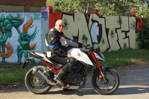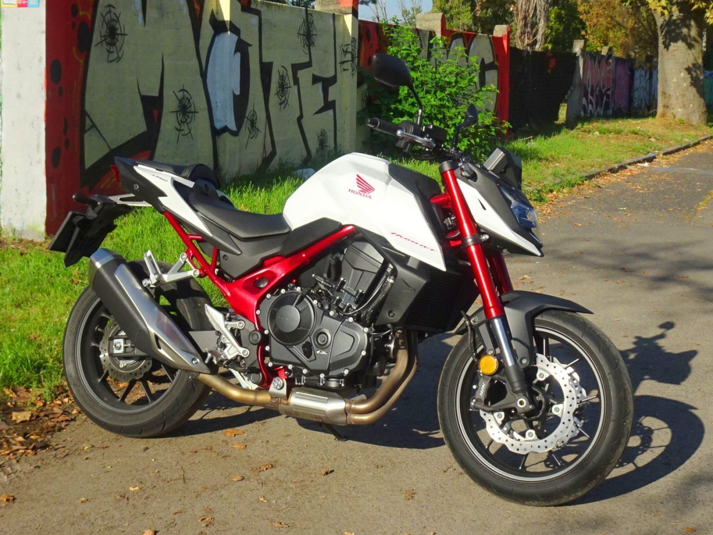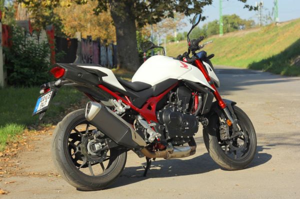 Amikor megláttam közelről, azt gondoltam, na megint egy naked: semmi szélvédelem, kényelmetlen… Ebből a szempontból emlékeztet a régi Hornetre, de itt vége is a hasonlóságnak. Az előd 600-as és 900-as sornégyes volt, ez pedig… de ne szaladjunk annyira előre. Második ránézésre feltűnt, hogy milyen szuperjó a színe. A Pearl Glare White elnevezésű színösszeállítás tartalmaz egy gyönyörű, leírhatatlan vörösmetál vázat, egy gyöngyházmetál tankot és lámpaidomot valamint hátsó részt, alul ott kanyarodik a krómbetétes kipufogó, és az egészet feldobták itt-ott mattfekete elemekkel. Az embernek megindul a nyálelválasztása… (magyarázat: a kívánás jele a nyálcsorgás)