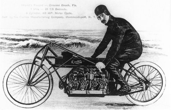 Glenn Curtiss a XX. század elején már a repülőgépipar egyik legendája volt, kísérleti légi járművei miatt különösen nagy tisztelet övezte. Curtissnek azonban nemcsak a repülés, hanem a motorkerékpárok is a szenvedélyei közé tartoztak és elhatározta, megépíti a világ leggyorsabb kétkerekűjét. A June Bug repülőgépet hajtó léghűtéses V8-as blokkra esett a választása, amely 4,4 literes lökettérfogatból 40 lóerőt szabadított fel. Az egyszerűen Curtiss V-8 névre keresztelt, 1906-ban épített masina be is váltotta a reményeket, 1907-ben ugyanis Glenn Curtiss 219 km/órás tempót ért el vele, amivel nem hivatalos sebességrekordot is döntött! A gép érdekességét nem csak a kerékpárszerű váza adta, hanem az is, hogy a 125 kg-os menetkész tömegből önmagában a V8-as erőforrás 68 kg-ot tett ki!
