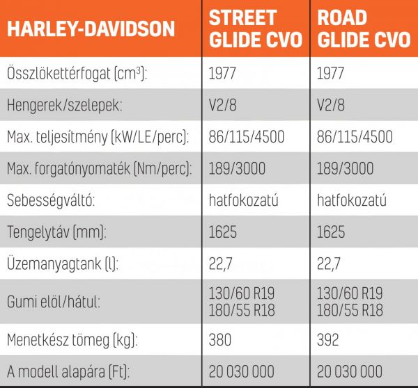 Miközben az üzemmódválasztó, a visszagurulásgátló, az abroncsonyomás-figyelő és a kanyar-ABS is jelzi a naprakész technikát, a konstruktőrök eltökélt szándéka volt, hogy a futómű és a fék terén felzárkózzon a legjobbakhoz a Street Glide és Road Glide. Az elképesztően vaskos, 47 mm csőátmérőjű Showa teleszkóp és a szintén a japán cégtől érkező hátsó rugóstag egészen más motorozási élményt ígér. A Harley úgy látszik hallgatott a kritikákra, a hátsó elem rugóútja 50%-kal nőtt a korábbi nemzedékekéhez képest. Ugyanakkor nem sokan élvezhetik majd az új topmodellek tudását, ugyanis ezek a CVO modellek is korlátozott példányszámban készülnek. Az árak természetesen csillagászatiak, a 20 030 000 Ft-os összeggel a páros a legdrágább ma kapható kétkerekűek szűk elitjébe tartozik. Főleg ha valaki hajlandó áldozni a barnás-vöröses Whiskey Neat árnyalatra, amelynek ára 2,9 millió Ft!