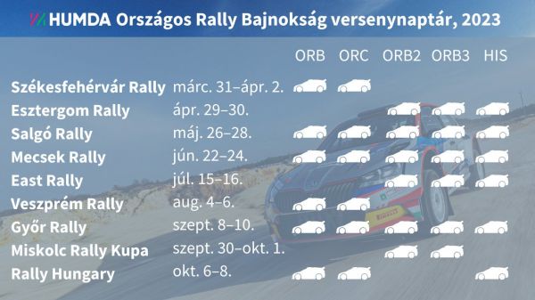 A március 31. és április 2. közötti Székesfehérvár Rally-val kezdődik és az október 6-8-i nyíregyházi Rally Hungary-val fejeződik be a HUMDA Országos Rally Bajnokság 2023-as szezonja. A szurkolók az előbbi két versenyen kívül az Esztergom Rally, a Salgó Rally, a Mecsek Rally, az East Rally, a Veszprém Rally, a Győr Rally és a Miskolc Rally Kupa futamaira látogathatnak ki. A bajnokság minden kategóriájának, tehát az Országos Rally Bajnokság (ORB) elnevezésű 1. osztály, az ORC, az ORB2 és az ORB3 névadó támogatója is az Ügynökség.