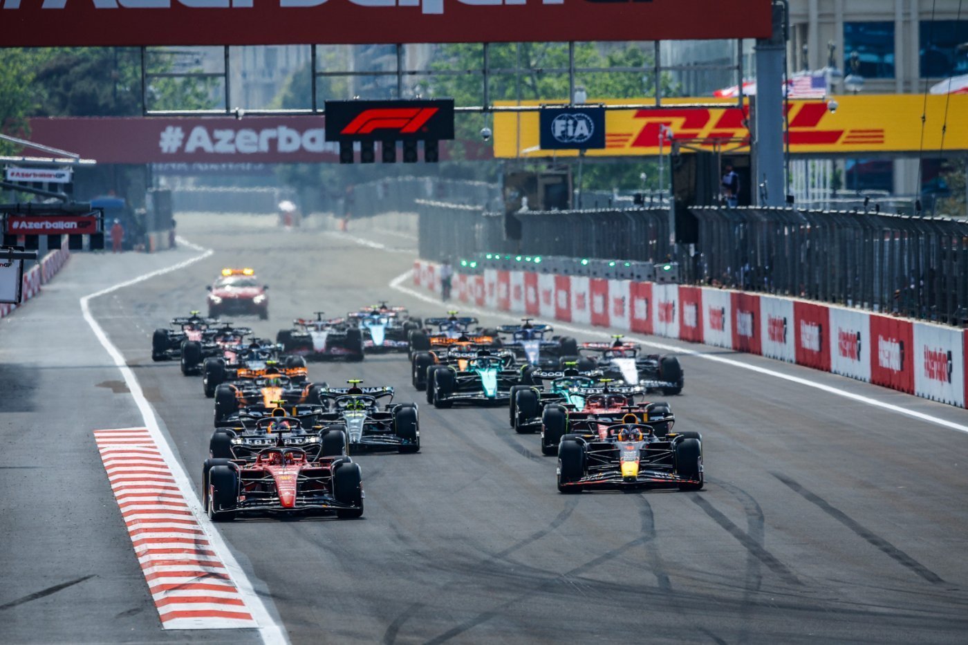 Meleg, napos, késő tavaszias időben vette kezdetét az 51 körös Azerbajdzsáni Forma-1-es Nagydíj. Bár Charles Leclerc vághatott neki elsőként a hosszú futamnak, mégis gyorsan átvette tőle a vezetést Max Verstappen, akit elég pechesen rosszkor, pont a biztonsági autós fázis előtt hívtak ki kerékcserére a bokszba, s ezzel a holland elvesztette az első helyezést és már vissza sem tudta azt szerezni. Korábban Nyck de Vries balesetezett, s emiatt kiküldték a biztonsági autót a pályára.
