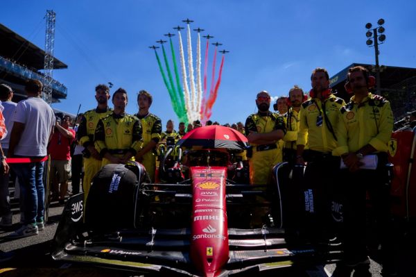 Rengetegen kilátogattak a Sebesség Templomába is, itt is kitették a megtelt táblát. Az olasz rajongók pirosba (és néhol az ünnepi sárgába) öltöztették a lelátókat, de sajnos nem láthatták ferraris hőseik valamelyikét nyerni. Leclerc azért ünnepelhetett a dobogón és ezzel emelhette a Ferrari évforduló fényét.