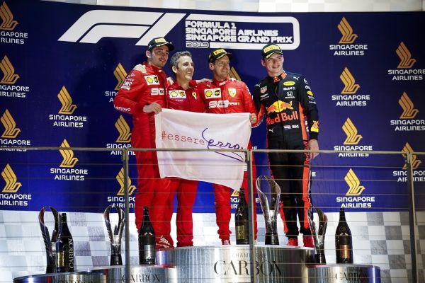 Továbbra is négy győztese van a szingapúri futamnak, hiszen a korábban itt már győzedelmeskedő Sebastian Vettel viheti haza a győztes trófeát. Vettel annak köszönheti győzelmét, hogy okos stratégiai húzással korán behívta a Ferrari a bokszba kerékcserére, így mikor Leclercen volt a sor, ő már nem tudott az élre visszakerülni a verseny végéig. Az előző két futamot, a két utolsó európai versenyt zsinórban nyerő monacói emiatt többször is nemtetszésének adott hangot a rádión keresztül, de a békát végül kénytelen volt lenyelni és elfogadni az ezüstérmes helyezést.