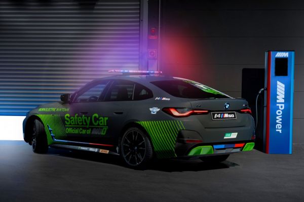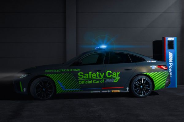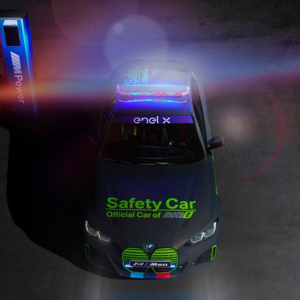 Nem véletlenül szoktak világos alapszínű autókat választani biztonsági autónak, hiszen annak jó láthatósága különösen fontos, a BMW azonban mégis mattfekete színű i4 M50 villanyautóból építette meg a MotoE versenysorozat felvezetőautóját; úgy voltak vele, hogy a tetőn lévő fényhíd és a neonfestékkel lekent részletek elég feltűnővé teszik a járművet.