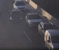Szombat délután az M1-M7 közös bevezetőjén a Magyar Közút forgalomfigyelő kamerája előtt büntetőfékezett egy kis furgon, melynek következtében három autó is balesetezett.