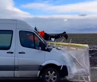 Az orosz kaszkadőr, Jevgenyij Csebotarev legújabb mutatványában egy kisteherautó belsején repül át.