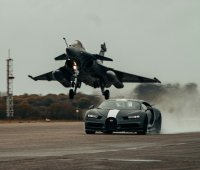 A Bugatti Chiron Sport „Les Légendes du ciel” és a Dassault Rafaele Marine vadászgépe egy kifutópályán mérte össze tudását.