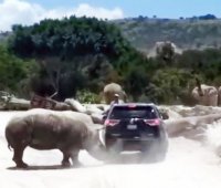 Rémisztő nyaralás: óriási orrszarvú támadt az autóra a szafarin – VIDEÓ