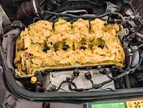 Az autó tulaja csupán a téli, fagytűrő ablakmosó folyadékot szerette volna utántölteni, de figyelmetlensége nagy kárt okozott. A mosófolyadék-tartály rendszerint kék kupakja helyett a motorolaj-betöltő sapkáját csavarta le, majd öntötte be a híg elegyet. Indítás után nem sokkal megadta magát a motor, amelynek szétbontása során ez a kép tárult a szerelők elé… Mivel a blokk belső fém alkatrészei nem szenvedtek mechanikai károsodást, csupán a kenőanyag és a mosófolyadék állt össze habszerű emulzióvá, teljes bontás és tisztítás után még megmenthető lesz.