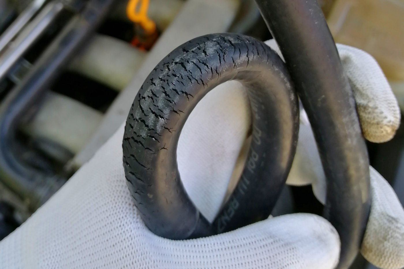 Vélelmezhettem, hogy a mostani csőnek sincs belül baja, azonban ez egy 60 cm-es szakasz a motor felett futva. Tehát elkezdtem kutatni a megoldások után, emiatt elmentem Dunakeszire, ahol van egy „csőspecialista”, már gyártottak nekem BMW E30-ashoz automatikus sebességváltó olajhűtéscsöveket. Megosztottam a problémát, és végül egy erősített hidraulikacső megvásárlása mellett döntöttem. Ez anyagjellemzőivel a legjobban hasonlít a gyári kivitelű csőre, így beszereltem az összerepedezett helyére. Most a próbaüzemét éli, és ha beválik a megoldás, amire nagy az esély, akkor ugyanezen csőből készíttetek egyet fittingelt véggel, mert vélhetően a gyár sem véletlenül használt menetes kötést a benzinhíd felőli oldalon. Egyébként szétvágtam a leszerelt, kívül repedezett csőnek egy darabját, de belül ez is épségben volt.