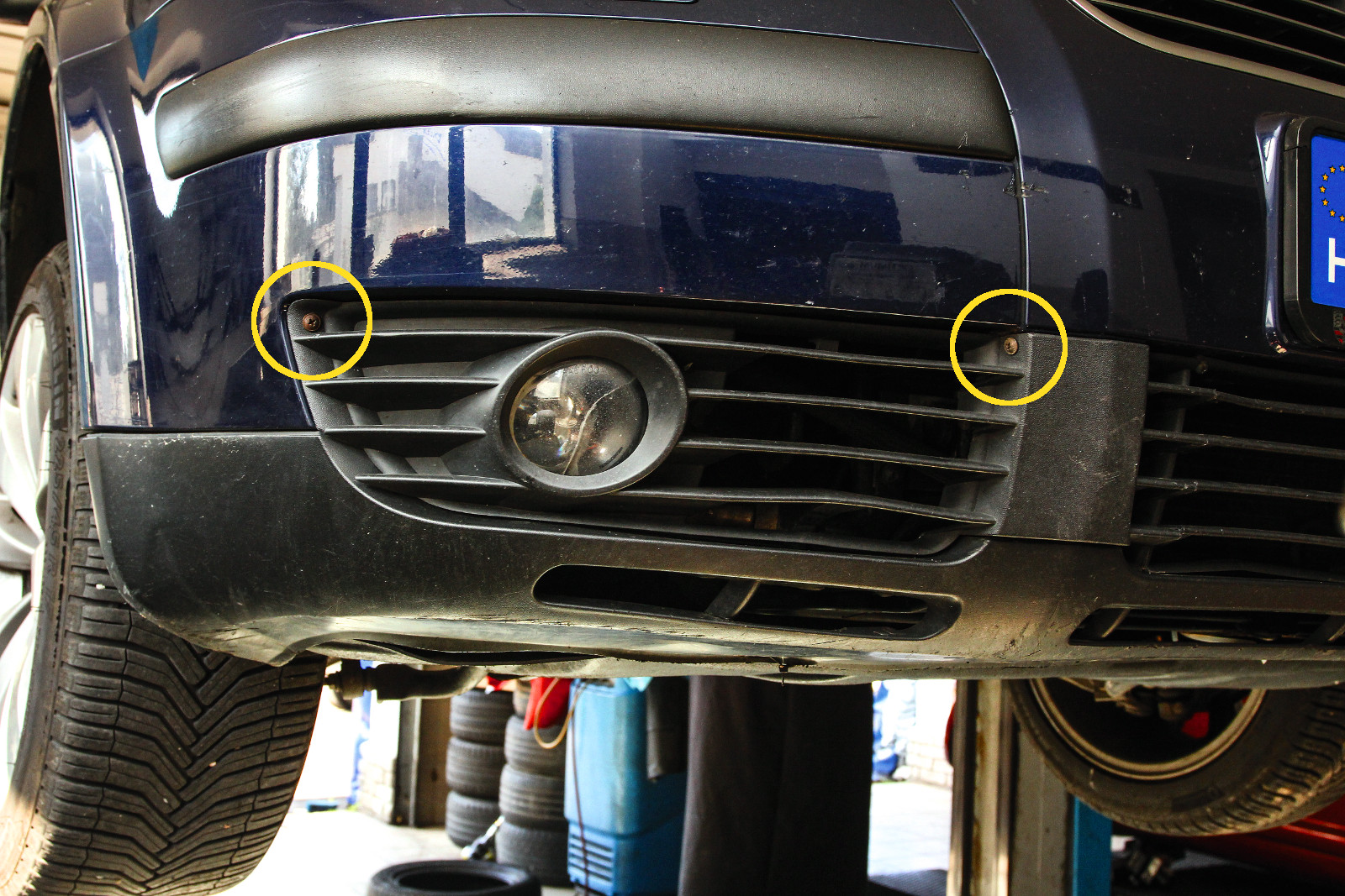 A gyors szemle megnyugtató volt, és kijelölte a feladatokat. Szerencsére a fényszóró épen maradt, a hűtő sem sérült, a lökhárító a karcoktól eltekintve nem szenvedett maradandó alakváltozást, de a rácsok fülei letörtek. A ködlámpa berepedt, a haspajzs rögzítőinek fele letört, a maradék átszakadt, az egész hátracsúszott a sérülés oldalán jó 12 cm-rel, s a hátsó tartólemez is deformálódott. A dobbetét rögzítései elöl eltörtek, és a betét kiugrott a helyéről. Távol a világtól a józan autós magára számíthat. Pár lemezcsavart sikerült összeszedni a csomagtartó zugaiból, meg a haspajzs megmaradtjaiból, és szerszámnak volt egy csavarhúzó meg egy univerzális „backtool”. Séta a helyi háztartási boltba, ott lemezcsavar helyett facsavar volt, és bekerült a zacskóba még egy csomag kábelkötegelő is. A fáskamrából egy elfűrészelt gerenda lett a „csápos emelő”, a jobb első kerékkel ráállva. A többi kerék kiékelve, a kocsi meglökdösve, hogy stabilan áll-e, majd jöhetett a javítás, amely elsőként a haspajzs helyrerángatásából állt. Ezután már nem volt útban, vissza lehetett pattintani a dobbetétet, a helyére nyomni a lökhárítót – szerencsére annak a rögzítője csak szétugrott, nem tört. Következett a haspajzs rögzítése. Elöl a kötegelők lettek átfűzve a patentfuratok helyén – azok kiszakadtak. Így már nem lógott le, majd jobboldalt – mivel a dobbetétről leszakadt – a haspajzsrögzítő furatok környékén is a facsavarokhoz kellett folyamodni. Óvatosan szabadott buherálni, mert a belső oldalon futnak a légkondicionáló visszatérő csövei. A haspajzs-dobbetét kérdés megoldva, a funkcióját ellátja, nem szép a rögzítés, de senki nem látja. A megmentett fekete fejű lemezcsavarokkal a középső lökhárítórács két helyen (ez deformálódott, a fül mellett elszakadt, de a fül megmaradt), a ködlámpa körüli rács (eltekeredett, a rögzítőfülei letörtek) három helyen lett odacsavarozva, azért így, hogy ne legyen túl feltűnő. A végeredmény kielégítő lett, pár méterről nézve fel sem tűnt a sérülés, közelebbről is inkább csak az autókat ismerők vehették észre.