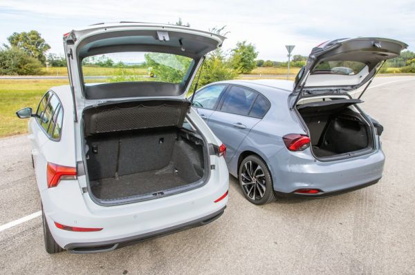 Nyugodtan kijelenthetjük mindkét típusról, hogy a csomagtér-kapacitás tekintetében a kategória legjobbjai közé tartoznak! A Fiat alapból 440 litert fogadhat be, a Škoda pedig még ezt is überelni tudja további 27 literrel. Bővítés után ugyan mindkét modellben keletkezik egy kis lépcső, de a Škoda azért több gondot fordított a részletekre, a Scala kapcsán említésre méltó az oldalsó akasztófül és a kalaptartó alján lévő háló. A hátsó ülések ledöntése egyébként pont fordított, a Fiatnál 60:40, a Škodánál 40:60 arányban osztottak a támlák.
