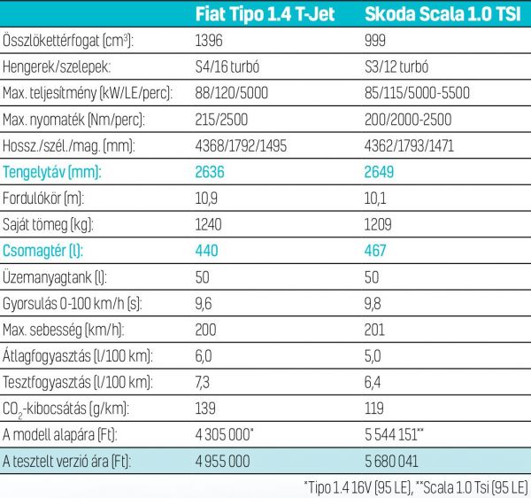 A Škoda tágasabb, modernebb és takarékosabb, szóval ha így nézzük, kézzel fogható, hogy újabb fejlesztés. A Tipo produkciója sem gyenge, de a legtöbb területen lépéshátrányban van a Scalához képest, és összességében olcsóbb autó benyomását kelti. Az árazás viszont a Fiat felé billentheti a mérleg nyelvét, hiszen a 120 lovas, 1,4-es Tipo félmillióval olcsóbb a 95 lóerős bázis Scalánál. Aki rászán hat milliót a Scalára, biztosan boldog lesz vele, de ha kicsit szűkösebb a rendelkezésre álló keret, a Fiat árelőnye már döntő lehet a vásárlásnál.