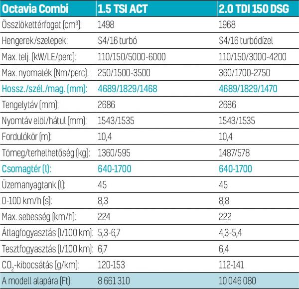 Az 1,5 literes, turbós benzinmotor már az előző generációban is szolgált, azonban az új nemzedékben alapáron jár hozzá a fogyasztást részterhelésen csökkenteni hivatott hengerlekapcsolás, és a motorleállító rendszer is többet hagyja pihenni az erőforrást. Szokni kell, hogy a motor nem kuplungolásra, hanem a fékről lelépve éled fel, szerencsére alacsony fordulaton is jól terhelhető a négyhengeres, igaz, gyors indulásnál nehéz a gáz megfelelő adagolása. Nagyon hosszú lett a hatfokozatú váltó áttételezése (második fokozatban 100 km/óra fölé szalad az Octavia), nagyok a fordulatszámugrások a fokozatok között; szerencsére széles a használható fordulatszám-tartomány és csendes a motor. Mindezek hatására tényleg alacsony lett a tesztfogyasztás, igaz, klasszikus városi közlekedés nem volt a programban, de egy 150 lóerős benzinmotortól jó a 6,7 l/100 km-es átlag autópályás/országúti használat mellett.