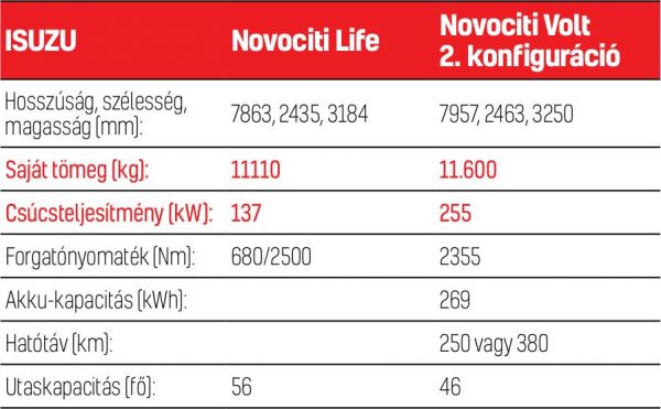 A Novociti Life dízelmotorja Cummins gyártmány, erőátvitelnek hatfokozatú manuális sebességváltó, vagy kétféle Allison automata választható. A tisztán elektromos (BEV-besorolású) Novociti Volt hajtásrendszerének üzemi feszültsége 400 volt, az elektromos személyautókhoz hasonlóan a két Isuzu közül az elektromosnak nagyobb a teljesítménye és a nyomatéka, méghozzá jelentős mértékben. Ennek megfelelően dinamikus gyorsulásokra képes, megy, mint a golyó. A specifikációtól függően 211 vagy 269 kWh kapacitású lítium-ion akkuval 200 (klíma nélkül 300) vagy 250 (klíma nélkül 380) kilométeres hatótávot ígérnek a gyári adatok. Ezt azért szívesen követném végig egy valóságos utasszállító műszakban – valószínűleg a lehetséges maximumról beszélnek, a lehető legkedvezőbb körülmények között. Az akkutelep súlya, ahogy elektromos járművektől megszokhattuk, nem éppen csekély: 1544, illetve 1901 kilogramm. Töltési időként egyenárammal legfeljebb két órát, váltóárammal nyolc és felet mondanak, a nagyobb akku megfelelő adatai 2,5 és 11 óra. Ez belefér az éjszakai üzemszünetbe. 150 kW-tal tíz perc alatt érhető el 30 kilométeres hatótáv. Az akkura nyolc év garanciát adnak, ez azt jelenti, hogy éjszakai árammal töltve ennyi idő után is megmarad a kapacitás 80%-a.