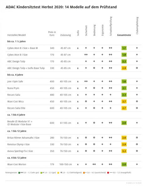 Az idei második gyermekülés-tesztjükben az ADAC német és az ÖAMTC osztrák autóklubok összesen 14 ülést vizsgáltak frontális- és oldalirányú törésteszten, kezelhetőség és ergonómia, valamint károsanyag-terhelés tekintetében. Nyolc jó és hat kielégítő eredmény született, ami azt jelenti, hogy általánosan megfelelő védelmet nyújtanak a vizsgált gyermekülések. A legjobb eredményt 1,6 pontszámmal a Joie i-Spin Safe szerezte, a második 1,7-es pontszámmal a Cybex Aton B i-Size Base M lett.