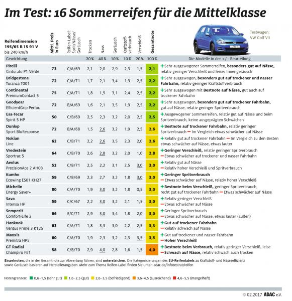 A személyautó-abroncsokat a 195/65 R15 V méretben vetették össze, itt egyedül a GT Radial Champiro FE1-es zárt „feltételesen ajánlott” eredménnyel a nedves aszfalton mutatott teljesítménye miatt. Ki kell emelni a mezőnyből a Pirelli Cinturato P1 Verde, a Bridgestone Turanza T001, Continental ContiPremiumContact 5, Goodyear EfficientGrip Perfomance és Esa-Tecar Spirit 5 HP abroncsokat, amelyek „nagyon ajánlott”-ként fejezték be a tesztet.