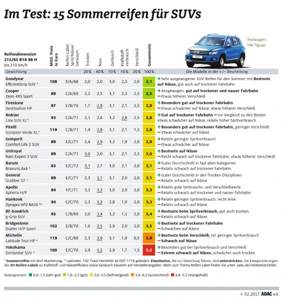 A szabadidő-autóknál általánosan elterjedt a 215/65 R16 H méret, itt csak két abroncs lett ”nagyon ajánlott”: a Goodyear EfficientGrip SUV és a Cooper Zeon 4XS Sport. A nedves aszfalton mutatott gyenge teljesítménye miatt lett „feltételesen ajánlott” a Michelin Latitude Tour HP, a Yokohama Geolandar SUV még gyengébb nedves aszfalton, amiért a tesztben egyedüliként „nem ajánlott” eredménnyel végzett. Azért hiányzik néhány nagy név ebből a méretosztályból, mert kifejezetten szabadidő-abroncsokat vizsgáltak, és a Continental és a Dunlop ilyet nem kínál.