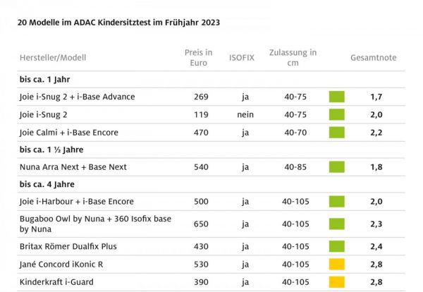 A babahordozóknál a Joie i-Snug 2 + i-Base Advance lett a tesztgyőztes, ami könnyű és nagyon biztonságos, a nagyjából 1 éves korig használható ülés ára Németországban 269 euró. A gyermeküléseknél a Joie i-Harbour és az i-Base Encore kombinációja nyújtja a legjobb védelmet, a nagyobb gyermekeknél – akik már az autóövet használják – a Cybex Solution G-Fix a legjobb választás a vizsgált 20 ülés közül.