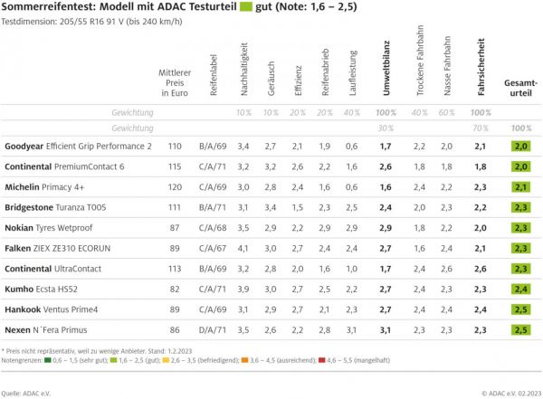 Egy gyártó különböző abroncsai nagyon is eltérőek tudnak lenni. A Michelin e.Primacy egyedüliként kapott „nagyon jó” minősítést a környezetvédelem fejezetben 71 500 km-es becsült futásteljesítménnyel, de mivel nedves aszfalton csak „elégséges” teljesítményt nyújt, nem tudják ajánlani a szakemberek. A legkiegyensúlyozottabb abroncs a Michelin Primacy 4+ lett, amely „jó” eredménnyel zárja a környezetvédelem és a menettulajdonságok fejezetet is. Pozitívan említik meg a Goodyear Efficient Grip Performance 2 és a Continental UltraContact abroncsot is, bár utóbbi gyengélkedik nedves aszfalton. A menettulajdonságok fejezetet egy másik Continental abroncs, a PremiumContact 6-os nyeri meg, ami a Goodyear Efficient Grip-pel közösen vezeti a mezőnyt, ezek után a Nikoan Wetproof következik.