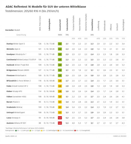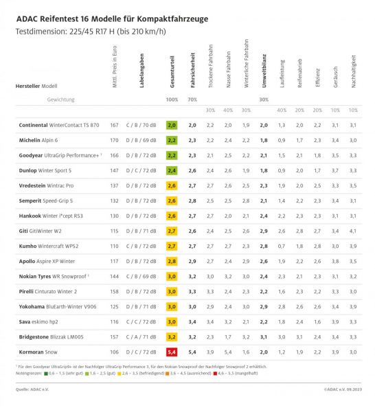 Idén az ADAC és az ÖAMTC autós klubok 2 méretben (205/60 R16 és 225/45 R17) vizsgáltak téli abroncsokat, és a 4 prémiumgyártót emelik ki a mezőnyből, hiszen a Continental, Dunlop, Goodyear és Michelin abroncsai mindkét teszten az első 4 helyezést szerezték meg. A 2023-as téligumi-teszten egyébként egy kicsit módosítottak a metodikán, a végeredményhez 70%-ban veszik figyelembe a „Menettulajdonságok” és 30%-ban a „Környezeti terhelés” fejezetet – ez jelentősen megváltoztatta a sorrendet.