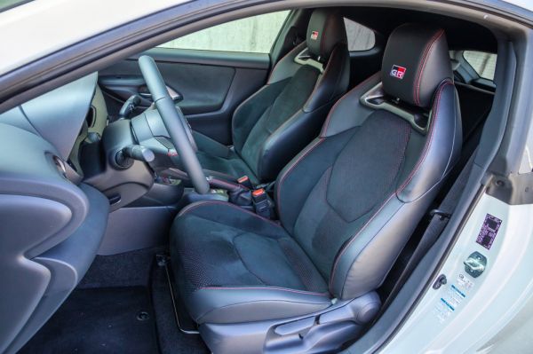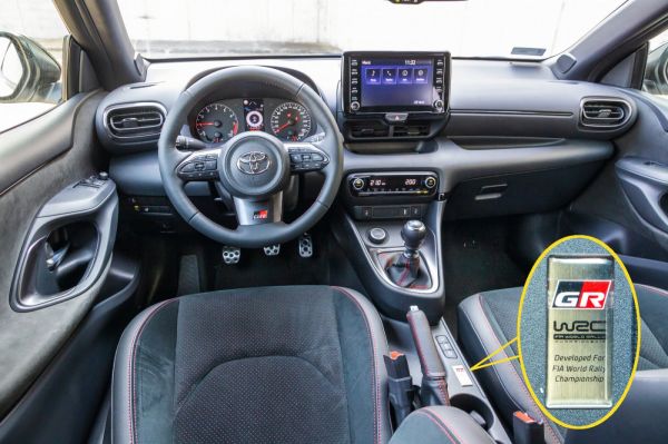 Mivel a Mitsubishi Lancer Evók és a Subaru Impreza STI-k óta egyetlen márka sem dobott piacra utcai WRC-megfelelőt, érthető, hogy a napokat visszaszámlálva vártam a találkozás pillanatát. És valóban, élőben nagyon „működik” a forma! Versenyautósan agresszív az orrkiképzés, a kerékjárati ívek pedig extra szélesek, ami a hátul összehúzott utaskabin miatt olyan vállasnak láttatja, mintha bodybuilder lenne. A sima Yarisokhoz képest ugyanakkor a tető anyaga és vonala is más, a szénszálas polimerelem annyira lejt, hogy egészen minimális a csomagtérajtó üvegfelülete. Miután átbogarásztam az útmutatót a minimum 98-as oktánszámú benzin tankolására és a turbó hűtésére vonatkozóan, a kagylóülésben helyet foglalva rögtön világos lett, hogy a belső nem a dizájnerek jutalomjátéka volt. Ez a műszerfal annyira egyszerű, hogy tíz évvel ezelőtt is konzervatívnak mondtuk volna, és úgy általánosságban sem kezd el nagyon hevesen verni az ember szíve ettől a berendezéstől. Ez az autó nyugodtan kaphatott volna egy külön óracsoportot középre a turbónyomással, olajhőmérséklettel. Az viszont már egyáltalán nem szubjektív, hogy a kiálló érintőképernyő és a tükör között csak parányi az üvegfelület, az ülések szorításán és a tető közelségén kívül emiatt is bunkerszerű a GR Yaris beltere.