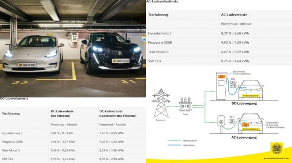 Az ÖAMTC szakemberei az optimális 22°C-ra temperálták az akkumulátort a töltés megindítása előtt, és az 1%-ra lemerített telepet 100%-ig töltötték. Normál (AC) töltésnél jutnak szerephez a fedélzeti töltők, amelyek 94% körüli hatékonysággal dolgoznak, ennél lehetne jobb hatékonyságú darabokat is gyártani, de a technológia jelen állása szerint azok sokkal nagyobbak, nehezebbek és drágábbak lennének. Ehhez hozzájön még a kábeleknél tapasztalható veszteség (melegedés), és így jön ki a töltési veszteség. A villámtöltésnél (DC) a legnagyobb vesztességgel járó váltóáram/egyenáram átalakításra a töltőoszlopon belül kerül sor, ezt is mérték az ÖAMTC szakemberei. Ezen a téren a Hyundai lett a legjobb, ami kevesebb, mint 0,5%-os veszteséget produkál az autón belül, ehhez képest az utolsó Peugeot 3,5%-os veszteséggel dolgozik autón belül.