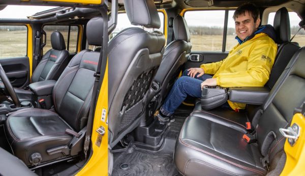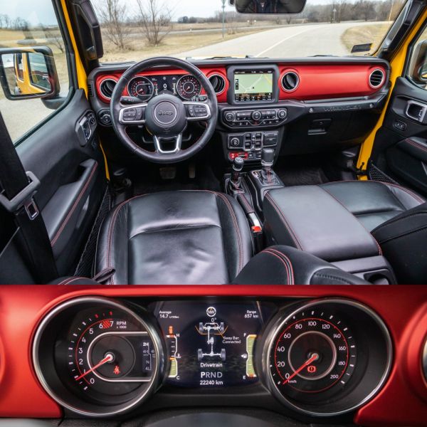 Fontos, hogy milyen fényezés mellett döntünk, mert az utastérben látszik majd a fém alkatrészeken. Ezért is meglepő, hogy a Rubicon felszereltség esetén a külső színtől függetlenül matt piros betét kerül a műszerfalra. Ettől eltekintve, miután a kapaszkodó segítségével bemászunk a vezetőülésbe, egy látványra és anyagminőségre is kidolgozott, igényes belsőt látunk. Ebben a Jeepben is nagy gondot fordítottak a részletekre, még a gombok és kapcsolók is stilizáltak, itt minden a masszív, terepes igénybevételről szól, nem csak a kapaszkodó, más felületek is gumírozottak. A központi érintőképernyő 4:3-as képarányával a régi időkre emlékeztet, ilyen az analóg műszeregység, melyben egy multifunkciós kijelző kapott helyett, de említhetjük az elődökéhez hasonló üléspozíciót, vagy az általános belső hangulatot is. Olyan érzés, mintha csak egy 80-as, 90-es években gyártott Wranglerben ülnénk, erre erősítenek rá a sík üvegek és a nagy, szögletes külső tükrök is. Utóbbiak egy átlagos tükörnél sokkal hasznosabbak, és a kis műszerfalnak köszönhetően a kilátás is jobb az átlagosnál.