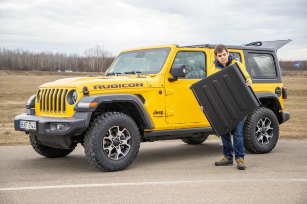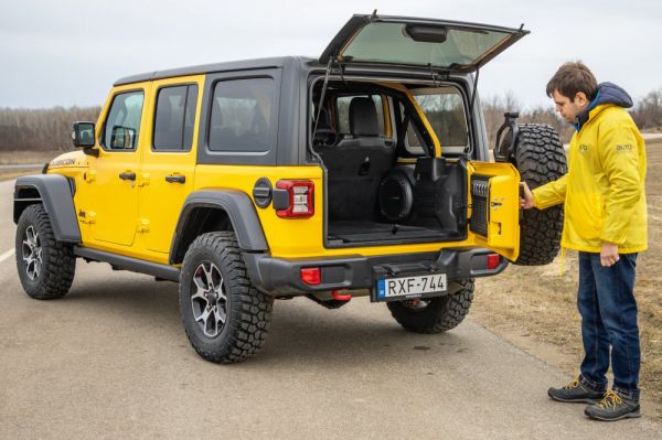 A szögletes karosszériában a helykínálat is megfelelő, de nem pazarló, a kétfelé nyíló ajtón át hozzáférhető csomagtartó praktikus. Ennek a megoldásnak is jó oka van, a karosszériaelemek ugyanis több lépcsőben leszerelhetők a Wranglerről. Reteszek oldásával kivehető a két első tetőelem, leszerelhető a hátsó üléssor és a csomagtartó feletti elem, sőt, az ajtóktól is meg lehet szabadítani, ilyenkor az egyébként is jól látható bukókeret garantálja a biztonságot. Említettem, hogy az ülésbe fel kell mászni, olyan magasan ülünk, hogy több SUV-nek is a tetejét látjuk a kormány mögül. A lábtámasz hiánya feltűnő, cserében mindkét oldalon kényelmesen könyökölhetünk. Utazásra is alkalmas a Jeep, többféle tárolórekeszt, hálós zsebet is találunk, nem hiányoznak a töltők és a különböző bemenetek sem.