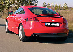 Az Audi kanyarokban is magabiztosan fogja az utat, nagy tempónál az orra finoman kúszik az ív külseje felé, ami óvatos gázelvétellel korrigálható. Viselkedése jóindulatú, csak durva vezetői hibák térítik ki a béketűréséből. Tesztautónkat a 348 ezer forintos Magnetic Ride futóművel szerelték fel. Gombnyomásra kétféle „hangolás” választható: normál és sportos. Előbbi esetben a TT majdnem olyan komfortos, mint egy VW Golf, tudomást sem vesz a legtöbb úthibáról. Ha aktiváljuk a sport üzemmódot, érezhetően feszesebb lesz a csillapítás, kanyarokban minimálisra csökken a karosszéria dőlése. (A változó viszkozitású folyadékkal töltött lengéscsillapítóban egy elektromágnes ezredmásodpercek alatt ráncba szedi a folyadékban úszkáló fémszemcséket, ezáltal a folyadék keményebbé válik.) Érzésem szerintem lehetne még radikálisabb, feszesebb a beállítás.