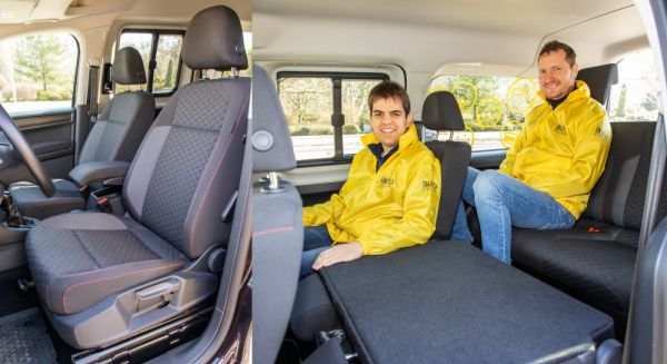 Ami ezért a kedvező árért biztosan benne van a Caddyben, az a praktikum. Az egyterűek harmadik üléssorában általában gyerekek férnek el kényelmesen, a VW modul egyterűje nagyobb, kényelmesebb üléseket és ideális méretű lábteret is biztosít, sőt, az ülések mögött ott egy 530 literes, alacsony rakodóperemű csomagtartó! Ezt úgy érték el, hogy az egyterűektől eltérően nincs nagy különbség a három sor helykínálata között, a magas tetőnek köszönhetően azonban ezzel együtt is jó a térérzet. Kényelmes a beszállás, az ajtók trezorszerűen csukódnak, a tolóajtók könnyen mozognak, a második üléssor háttámlájának ledöntése és az ülőlap előrebillentése után leghátra beülni is gyerekjáték.