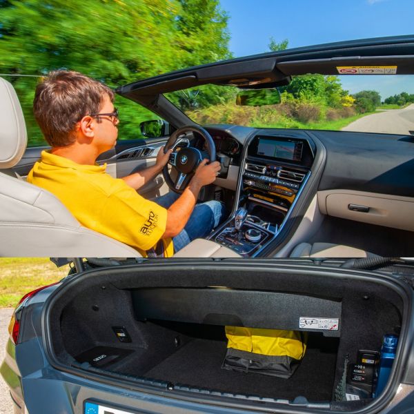 A 840d Cabrio egyértelműen lepipálja elődjét, amely nem más, mint a 6-os sorozat vászontetős változata. A névváltozást az indokolja, hogy az új generáció már nem az 5-ös, hanem a 7-es sorozat technológiájára épül, illetve igyekeztek ezt a modellsorozatot feljebb pozicionálni, ezért kár feszegetni, hogy méltó-e a 8-as névre! Külseje nem formabontó, mégis lenyűgöző, utastere ebben a világos konfigurációban a feltűnéskeltésről szól, az üveg díszítőelemek a Rolls-Royce világát idézik. Bár négyszemélyes – hasonlóan a Z4-eshez –, két embernek kényelmes igazán. Impozáns méretei ellenére csekély a hátsó lábtér, ráadásul a tempós kabriózáshoz nagy szükség van a szélfogóra, amely lehetővé teszi, hogy 90 km/órás sebesség felett is huzatmentes maradjon, sőt, a csomagtartó méretét lecsökkentő tető is önmegtartóztatásra készteti az utazókat. Csukott állapotában jóval több holmi fér el benne, a négyrétegű vászontető a zajokat is hatékonyan kizárja.