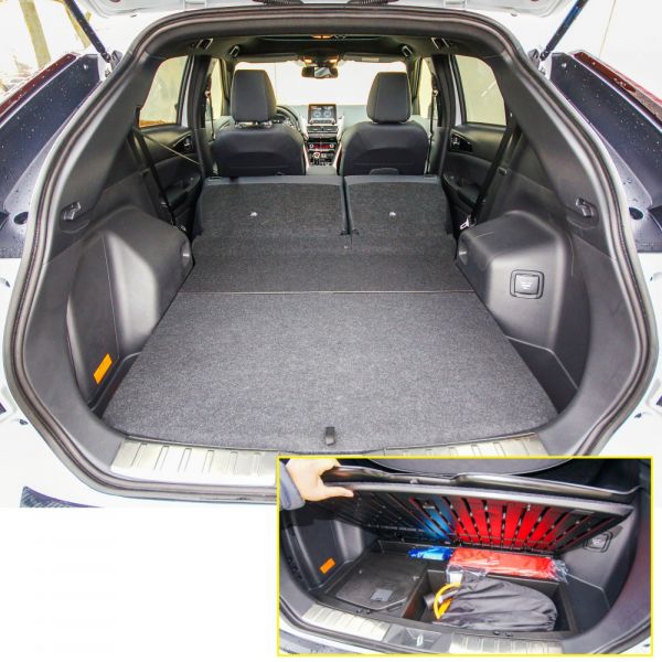 Formaterve harsány és látványos, gyári tartozékokkal kiegészítve sportos stílusú, ellenfeleihez mérve naprakész, illik a jelenlegi japán választékba. Tsunehiro Kunimoto eredeti dizájnját a frissítés során csak annyival tették egyszerűbbé, hogy hátul a kettéosztott ablak és a csíkszerű lámpák helyett a hagyományos elrendezést, illetve az üveg vonalát követő világítótesteket választották. Ezzel harmonikusabbá vált az összkép, sőt, az eredeti Eclipse-re utaló kupés tetővonal is jobban érvényesül. Ahogy a hasonló riválisok esetében, úgy az Eclipse Crossnál is egyszerre áldás és átok a divatos kialakítás, ugyanis a magas hátsó ülés miatt beülés közben az utasok beüthetik a fejüket a tetőbe. Bár a fejtér sem bőséges, bent már sokkal több hely áll rendelkezésre, mint a sziluettje sejteti, ugyanakkor a lecsapott ablak alatt a csomagtartó kisebb, mint a külméretek alapján várható lenne. A kalaptartóig 328, a tetőig pakolva 471 literrel gazdálkodhatunk, a padló alatt rekeszeket alakítottak ki, melyek a kötelező tartozékok mellett a töltőkábeleket is elnyelik. Magas pereme mellett az ajtó nyitása is megtornáztatja a családtagokat, a kilincs a rendszámtábla felett van, emiatt kissé kényelmetlen a nehéz fedél felemelése. Eddig kevés autóból hiányzott az elektromos mozgatás, ilyet azonban a tesztelt, 16 890 000 Ft-tól elérhető Instyle navi csúcsfelszereltség feláras extraként sem kínál.