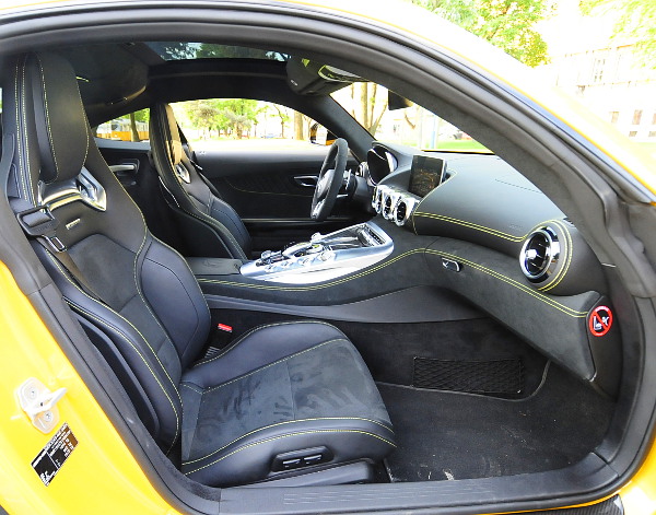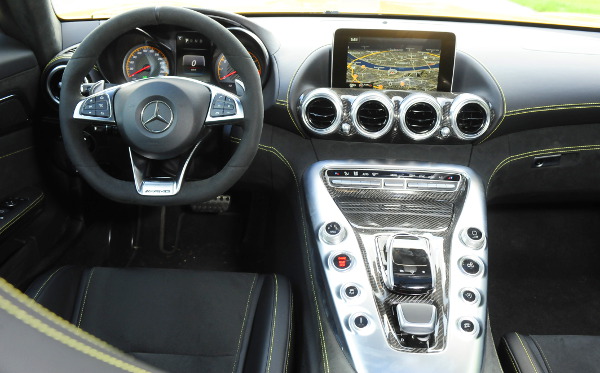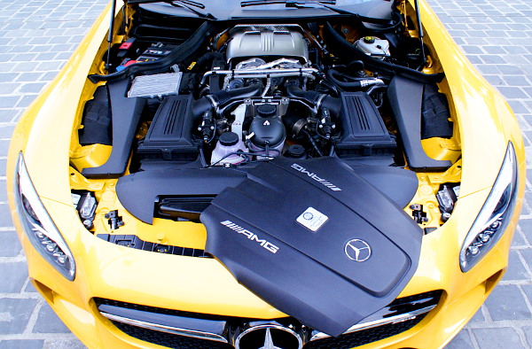 Mondjuk a beszállás így is felér egy tornagyakorlattal, hiszen a masszív küszöbön átlendülve szinte a földre huppanunk. Mielőtt magunkra zárnánk az ajtót, érdemes beállítani az elektromos, látványban és oldaltartásban egyaránt szigorú sportüléseket, máskülönben nehézkes hozzáférni a gombokhoz. A pilóta és az utas között olyan széles középalagút terpeszkedik, mint egy repülőgépben: a kézírás-felismerős Command vezérlőegysége és a váltó kisméretű előválasztó karja (kissé hátra került) mellett, a két szélén sorakoznak a legfontosabb gombok: például a motorindításé. Megnyomására harsányan felugat a 6,2 literes, V8-as szívómotort nyugdíjazó 3982 cm3-es, közvetlen befecskendezésű, bi-turbó V8-as. A kézzel összeszerelt motor szárazkarteres olajozást kapott, a feltöltőket a hengersorok közé integrálták és a lehető legjobban hátratolták. Az orr-középmotoros kialakításon kívül az ideális, 47:53 arányú tengelyek közötti súlyelosztást szolgálja az is, hogy a hétfokozatú, duplakuplungos Getrag automatikus váltót a hátsó tengelynél építették be (transaxle elrendezés) – széria a hajtáslánc nemkívánatos mozgásait mérséklő lengéscsillapítás, opcióként pedig dinamikus motor- és váltótartó bakok rendelhetők. Az AMG Dynamic Select menetdinamika-szabályzóval egyéni, komfortos, sport, sport+ és versenypályás üzemmód közül választhatunk.