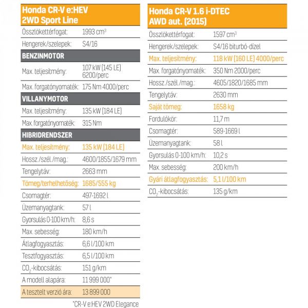 Az adottságai révén méltán népszerű CR-V jelenleg az 5. nemzedékénél jár, a legutóbbi, 2017-es generációváltás a gyártó hagyományaihoz hűen alig hozott változásokat a dizájn frontján. A technika a 2020-as frissítés alkalmával módosult gyökeresen, ekkor került ki a választékból a takarékos dízel és lépett a palettára a 2,0 literes, benzines szívómotoron alapuló full hibrid verzió. Összehasonlításunk apropóját a szöges ellentétet mutató erőforrások adták, az egyik szereplő a szerkesztőségünknél maratoni futást teljesített e:HEV, a másik pedig a szomszéd baráti család 2015-ös évjáratú gázolajos masinája.