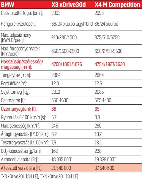 A 3,0 literes, dízel X3-as mindent tud, amire egy prémiumautó-vásárló vágyhat, miközben racionális döntésnek számít. Az X4 M az SUVműfaj öncélú, de nagyon szórakoztató csúcsragadozója, éppen ezért pozitívum, hogy a BMW kínálatában mindkettő megtalálható.