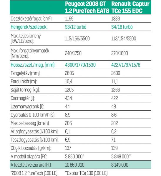 Elsőre ijesztőnek hat a Peugeot ára, hiszen a 2008 GT a 300 000 Ft-os importőri kedvezménnyel kerül 10 660 000 Ft-ba. Ezért az összegért egy teljes körűen felszerelt autót kapunk, a számos segédet felvonultató vezetéstámogató csomag, az Alcantara kárpit és a navigációs rendszer is alapból jár hozzá, illetve még a Fusion narancsszínű fényezésért sem kérnek felárat. A Renault más árpolitikát választott: a Captur TCe 155 EDC 8 149 000 Ft-os árával 2,5 millióval olcsóbb a 2008-asnál, viszont a navigációs rendszer és a Peugeot-hoz alapáron adott segédberendezések felárasak – azonos szintre hozva is jelentős marad a Captur árelőnye. Viszont a teljes képhez hozzátartozik az is, hogy a Peugeot importőri kedvezményével, amely bizonyos változatoknál 600 000 Ft is lehet, a 2008-as többi verziója már nem feltétlenül drágább, például dízelként (1.5 BlueHDi 100, illetve dCi 115) az oroszlános modell az olcsóbb. A 100 lóerős benzines bázistípusok esetében 5 850 000, illetve 5 849 000 Ft szerepel az árcédulákon, igaz, a Renault esetében 200 000 Ft értékű használtautó-beszámítási támogatással is lehet kalkulálni.