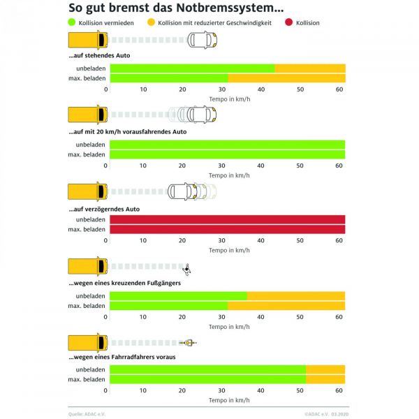 A könnyű haszonjárművek baleseteinek a felét el lehetne kerülni vagy jelentősen mérsékelni lehetne a súlyosságukat a vészfék-segéd és a sávtartó rendszer bevezetésével. Az EU ezek közül az elsőt teszi kötelezővé 2022-től, a már ismert jogszabály-szövegben előírt vizsgálati módszerek alapján (közeledés álló autóhoz, közeledés haladó autóhoz, közeledés lassuló autóhoz, közeledés kerékpároshoz, gyalogos keresztezi a haladási irányt) végezték a teszteket az ADAC és az ÖAMTC szakemberei a ma piacon lévő modellekkel.