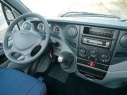 Belül az Ivecóra jellemző praktikum uralkodik, könnyen tisztítható felületekkel és néhol kissé rideg hatású műanyagokkal, de az egészet barátságosabbá teszi a kialakítás megannyi ötlete. Az új ülés kényelmesebb a réginél, ráadásul szövetborítást kapott, a kormánykerék, az ajtóborítás és a műszerfal egy része lágyabb tapintású lett, a hangulat pedig derűsebb. 182 centis termetemmel nem panaszkodhattam az ülés hátratolhatóságára, és a joystick-váltókar pompásan kézre esik. Tárolóhelyben nincs hiány, továbbra sem óriási, de azért nőtt a kesztyűtartó, nagyok az ajtózsebek, mindenfelé találni ilyen-olyan rekeszt, sok minden elfér a szélvédő fölötti polcon, a raktérből pedig „macskapadlás” nyúlik be a fülke fölé. Itt tarthatók a kocsi szerelvényei, elhelyezésük egyébként örök gond lenne.