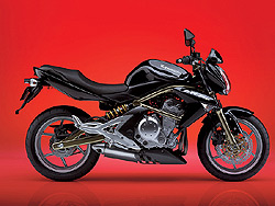 A Börzsöny kanyargós útjain megejtett menetpróba minden tesztelőnek mosolyt varázsolt az arcára. Elvégre egy kezesbárány bemutatójára érkeztünk, s komoly száguldás kerekedett belőle. Amikor megláttuk a Suzuki SV650 ill. a Honda Hornet ellenfelének szánt ER-t, egy visszafogott, hétvégi túragépet véltünk felfedezni. Formailag persze nem volt kifogásunk, de egyikünk sem gondolta, hogy az Euro 3-as szabványt teljesítő, ennek megfelelően erősen lefojtott, injektoros erőforrás mire képes. Szívató természetesen nincs. A környezetvédelem jegyében az indítást követően 50 másodperig 2000-es fordulaton berreg a masina, majd beáll a 800 körüli alapjárat. Vibráció szinte semmi, csak sokat sejtető hang. A váltó már az elején jelzi, hogy vele nem kell majd bajlódnunk. Gyorsan kapcsolható, nem akad meg a fokozatok között, és – ami sokaknak nagyon fontos – könnyen rakható üresbe. Az első méterek a felhasználóbarát működést támasztják alá. Óvatos gázadásra óvatos gyorsulás a válasz, a fékek adalgolhatósága példás, a tökéletes súlyelosztás révén pedig lépésben haladva sem kell imbolygástól tartanunk. Ahogy szépen lassan hozzászoktam a géphez, úgy mutatta meg, hogy milyen tartalékai vannak. Nem ágaskodik, viszont őrült módon gyorsul, s az ember nem győz kapcsolgatni, hogy tartsa a tempót a pillanatok alatt felpörgő, 72 lóerős aggregáttal. Észre sem vesszük, és máris 200 km/óránál küzdünk a menetszéllel, a motorban pedig még mindig van erő. Aztán jönnek a kanyarok és kezd letisztulni, hogy az arany középutat kedvelők ezentúl bármikor „megkattanhatnak”, hiszen szelíd kétkerekűjük nyolcezres fordulat felett még úgy húz, mint egy gyorsasági gép, s a futóműve sem riad vissza a nagy sebességgel bevett kanyaroktól. Kár, hogy mindössze a hátsó csillapítás előfeszítése állítható…