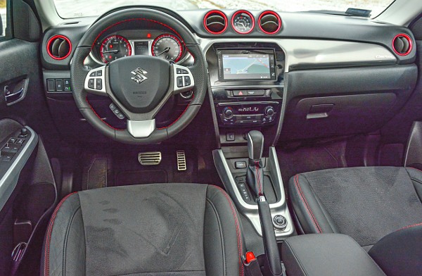Divatos belső, jól áll neki a fekete felületeket ékesítő piros szín (varratok, szellőző- és műszerkeretek). Fotó: Hilbert Péter Különösen úgy nem, hogy a japán modell kínálata szép óvatosan kibővült. Van szívómotor, dupla kuplungos sebességváltóval társítható dízel, a közelmúltban pedig egy 1,4 literes turbós benzinmotor is a szortiment része lett. Ha ez nem lenne elég, a Suzuki designerei egy S verzióval szabták át a Vitara arcvonásait. Itt vízszintes helyett függőleges osztású a frontrész, krómozott és színes dekorelemek tűnnek fel, a nappali menetfény LED-es, a kasztni pedig összesen hétféle színkombinációban (kocsitest+tető) választható. Ez így is van rendjén, senkit sem fog zavarni, hogy a Vitara S csupán a fehér, a szürke, a piros és a fekete különböző mixeiben variálható.