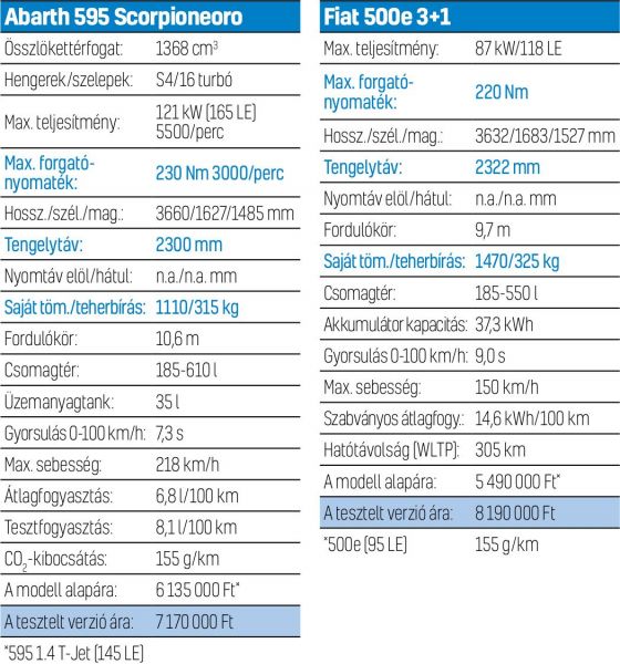 Akinek a báránybőrbe bújt farkasra fáj a foga, 6 135 000 Ft-tól elviheti az Abarth 595-öst, de a 165 lóerős teljesítményhez a 7 170 000 Ft-os Turismót kell választania. A kipróbált, fekete különlegesség már elfogyott, hasonlót azonban továbbra is rendelhetünk. Hozzá mérve nem is kiugró az 500e alapára, a 95 lóerős belépőmodell már 7 990 000 Ft-tól konfigurálható, ami állami támogatás igénybevétele esetén 5 490 000 Ft-ra mérsékelhető. Ennyiért azonban egy kisebb kapacitású akkumulátor jár, a tesztelt változatért legalább 9 990 000 Ft-ot kérnek. Ha a 3+1-es, aszimmetrikus ajtóelrendezésre is szükség van, az további 700 000 Ft-tal növeli a számlát, a tesztprogram tapasztalatai alapján egyértelműen megéri megfizetni érte a felárat. Az otthoni töltőkábel alapáron jár hozzá, a Type 2-es azonban 100 000 Ft-ba kerül, kivéve a tesztelt La Prima csúcsmodellt, melyhez azt is mellékelik. Lehet, hogy vannak a piacon több helyet kínáló, vagy akár nagyobb hatótávú villanyautók, de ha figyelembe vesszük, hogy egy retróautót kapunk a pénzünkért, az olaszoké jutányos ajánlatnak számít.