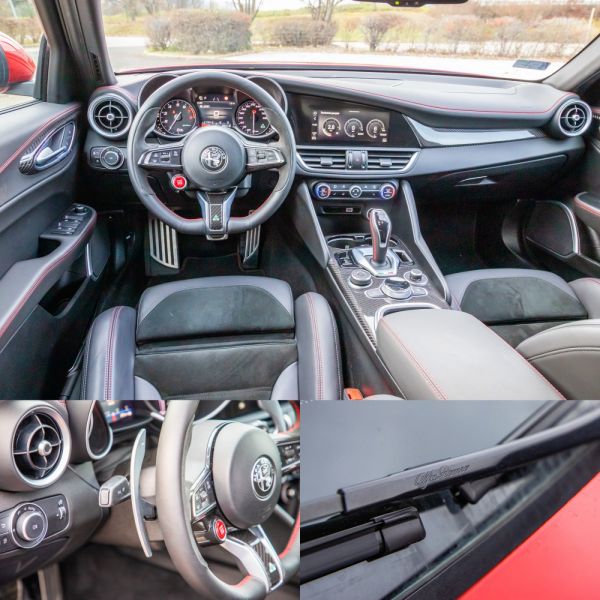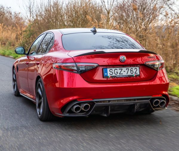 A Quadrifoglio modell megjelenését karbon légterelők és már alapesetben is látványos, 19 colos felnik dobják fel, a tesztautónál természetesen mindent a végletekig fokoztak, és ez jól van így! A Competizione piros fantázianevű fényezés (855 000 Ft) jól kiemeli a karosszéria domborulatait, a fekete karbondíszek pedig rögtön vészjóslóvá teszik a megjelenést. Az első sportülések jól tartják a testet, a kormány csak irányításra és nem kapaszkodásra szolgál, a helykínálat megfelel a kategória átlagának. Az aktív, elektronikusan vezérelt lengéscsillapítókat használó felfüggesztés meglepően kényelmes is tud lenni, már amennyire a körülmények engedik. Comfort módban kifejezetten jól kezeli az úttest felől érkező ütéseket és az úthullámokat is, tehát még rossz minőségű aszfalton is jó tempót lehet autózni. Persze a kátyúkkal vigyázni kell, mert nagyon alacsony az abroncsok oldalfala, és bizony a rugóút is véget ér egyszer, olyankor már igencsak ugrik az autó. De ilyesmire számítani kell, emlékeztetnék arra, hogy a Giulia Quadrifoglio sofőrjének a figyelme egy pillanatra sem lankadhat.