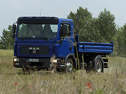 Ha most felsorolnám, hányféle szabálybéli korlátozást és milyen szigorú időtervet kell betartania egy sofőrnek, jócskán elmenne rá a cikkterjedelemből, így csak a fantáziájukra bízom. Szóval, éppen elég üggyel-bajjal jár, hogy a rendőrrel és a közlekedési főfelügyeletessel se legyen baj, de elégedett legyen a főnök vagy az ügyfél is. Kész idegbaj lenne, ha mindezek mellett még a jármű is feladná a leckét. Szerencsére az MAN hét és fél tonnás billenőse messzemenően leegyszerűsíti a munkát. Egyszerű maga a konstrukció, viszonylag alacsony létraalváz, acél laprugók, kettő (plusz egy) üléses fülke, három oldalra billenő acélplató – nagyjából ennyi. Persze, azért minden a legkorszerűbb színvonalat képviseli, ahogy el is várhatjuk a TGL sorozat tagjától.