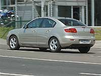 Az 1,6 literes, változó szelepvezérlésű motor egyenletesen adja le 105 lóerős teljesítményét. Kezdettől fogva jól húz a 3-as, ha pedig lendületes vezetéshez szottyan kedvünk, vagy éppen előzünk, akár a fordulatszámhatárig is pörgethetjük az egységet, hiszen akkor sem fogy ki a szuszból. Az ötfokozatú sebességváltó kissé hosszúra nyújtott áttételezése miatt az erőforrás ha nem is sportosan, de azért kellő dinamikával mozgatja a kocsit. Ráadásul a kiváló zajszigetelésnek köszönhetően a hangja sem zavaró, így autópályán nagy tempó mellett is komfortos az utazás. Persze, a fogyasztásra ez nincsen jó hatással, ahogyan a mellékelt ábra mutatja, a Mazda átlagosan 8,6 liternyi üzemanyagot is képes legurítani a torkán. A ferdehátú kivitelhez viszonyítva valamivel komfortosabb hangolásúak a limuzin első, MacPherson és hátsó, többlengőkaros felfüggesztési. Így aztán a kocsi elegánsabban lépi át az úthibákat, s a futóműzaj is csekélyebb (bár ez esetben nyári abroncsokat viselt a Mazda). Attól nem kell tartanunk, hogy a lágyabb futómű miatt esetleg kanyarban bizonytalankodik majd a 3-as, mert nagy tempónál is rendkívül jóindulatúan fordul, reakciói kiszámíthatóak. Ha úgy tartja kedvünk, akár élményautózásra is befoghatjuk a gépet, ugyanis a kormányzás közvetlen, az ötfokozatú, manuális sebességváltó viszonylag rövid utakon és pontosan kapcsolható, a négy tárcsafék pedig hatékonyan lassítja a Mazdát.