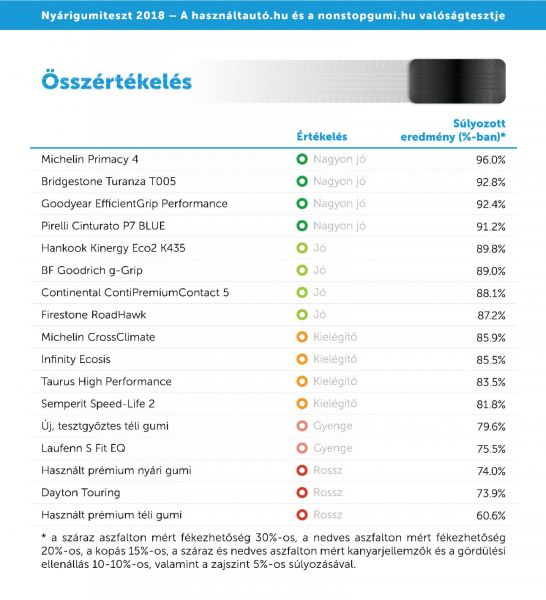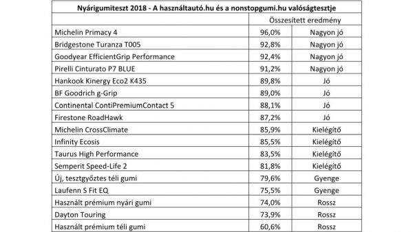 Az eredményeket szokás szerint és a korábban megszokott súlyozással összesítették. Minden egyes kategóriában az elért legjobb eredményekhez hasonlították a többit. Az összértékeléshez a száraz aszfalton mért fékutakat 30%-os, a nedves aszfalton mérteket 20%-os, a kopást 15%-os, a száraz és nedves aszfalton mért kanyarjellemzőket és a gördülési ellenállást 10-10%-os, valamint a zajszintet 5%-os súlyozással vették alapul. A részletes eredmények a www.autonavigator.hu/cikkek/nyarigumiteszt-2018 címen láthatók.