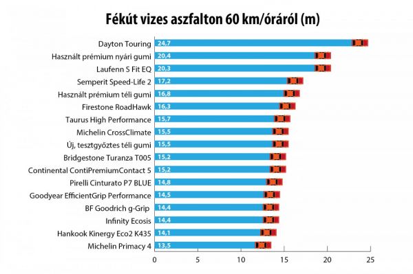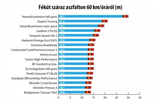 Száraz úton fékezhetőség és kanyarjellemzők szempontjából egyaránt a Bridgestone Turanza T005 jött ki győztesnek, míg vizes aszfalton a Michelin Primacy 4 adta a legjobb adatokat – őket az összesített dobogón a Goodyear EfficientGrip Performance követi. Meglepő módon az új téli gumi még egészen jó eredményt, nem egész 10 százalékos többlet fékutat adott a száraz fékezésnél, míg a használt, már hét esztendős, nem megfelelő körülmények között tárolt nyári gumi már több mint 40 százalékosat. Még drasztikusabb, hogy a használt, szintén sokat látott téli több mint kétszeres távon, 14 helyett 30,1 méteren állt meg.