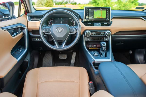 A 2,0 literes, 175 lóerős négyhengeres hatfokozatú kézi vagy fokozatmentes (CVT) váltóval és első- vagy összkerékhajtással konfigurálható. Burgundivörös gyöngyház fényezésű (300 000 Ft) tesztautónk a kínálat tetejét képviseli Executive csúcsfelszereltséggel, CVT-vel és 4×4-es hajtással. Formaterve az elődmodellnél karakteresebb, amerikaias vonásokat kapott, külseje egyszerre árulkodik masszív felépítésről és egy csipetnyi vagányságról, amire szüksége volt a RAV4-esnek. A karosszéria minden eddiginél szögletesebb vonalaira rímel a kerékjárati ív szintén szögletes kialakítása. Ez a stíluselem a Jeep védjegye, de a Toyotának is jól áll, és a japánoknak is van olyan nagy terepjárós múltja, ami indokolja a klasszikus terepes részletek használatát. Sőt, hiába maradnak vele a legtöbben az aszfalton, a RAV4 felépítése alkalmas a könnyebb terepek legyűrésére. A benzines hasmagassága a hibridénél 5 mm-rel nagyobb, 195 mm. Az összkerékhajtása nem állandó, hanem folyamatosan aktív, alapesetben az első kerekeket hajtja, majd amikor szükséges, a rendszer a hátsókra is juttat a nyomatékból, akár egy vehemensebb elindulásnál is egyszerre mozdítja meg az autót a négy kerék. Van is erő a klasszikus, 16 szelepes benzinesben, pörgetésre megmutatja, mire képes, ehhez azonban a CVT-váltónak is lesz egy-két szava. A változó áttételű szerkezet működési elve logikus, és azt a szisztémát követi, amely elősegíti a takarékos vezetést, hiszen a motor felpörgetésével viszonylag rövid idő alatt gyorsítja fel az autót a kívánt tempóra, majd, ha azt elérte, akkor a lehető legkisebb áttétellel, a lehető legtakarékosabb üzemben működteti tovább.