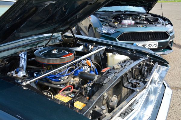 A kipróbált GT nem csak évjáratában és színében felel meg a filmes autónak, de a váltója is négyfokozatú, kézi. Orrában ugyan nem a 390, hanem csak a 302 köbhüvelykes, vagyis 6,4 helyett 5,0 literes V8-as duruzsol, így viszont összemérhető a tesztautóval, már csak azért is, mert a négytorkú karburátorral és a nyitott légszűrővel 230 helyett 280 lóerő körül teljesít, tehát valamivel erősebb a gyárinál. A motornak nem pusztán a hangja, a látványa is gyönyörű, nem is beszélve a bődületes erejéről. Impresszív, ahogy a gázra lépve bármilyen elektronika beleszólása nélkül nyit a pillangószelep és tombolni kezd a technika. Egyszerűsége és klasszikus felépítése miatt a teljesítménykülönbség ellenére is letaglózó az élmény. Komfortosan kezelhető, kormányát például sokkal könnyebb forgatni, mint az új változatét, kuplungja magasabban fog, váltója pedig kétszer olyan hosszú utakon jár, mégis pontosan, gépszerűen működik.