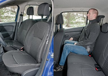 Az első ülések hozzák az elvárható komfortot, talán a lapjuk lehetne valamivel hosszabb. Az első elektromos ablakmozgatás kapcsolóit a középkonzolba integrálták, a hátsókat pedig a két első ülés közé – egyik sem esik kézre. A Renault raktárán maradhatott egy nagyobbacska szállítmány a Twingóból ismerős, kürtkapcsolós indexkarból, ennek kezelése is megszokást kíván. A kesztyűtartó mély és nagy, a váltó előtt dupla pohártartó, apró szépséghiba, hogy a kitüremkedő középkonzol miatt a félliteres palackokat csak enyhén döntve tudjuk elhelyezni. A szellőzés hatásos, de a ventilátor 1-es állásnál nagyobb fokozatban már zajos. A második sorban bőséges hely várja az utasokat, ami nem csoda, hiszen 2580 mm-es a tengelytáv. Alkalomadtán hátra akár hárman is beülhetnek, a fejtámaszok kellően magasra húzhatók ki, a középső padlóborda pedig alacsony.